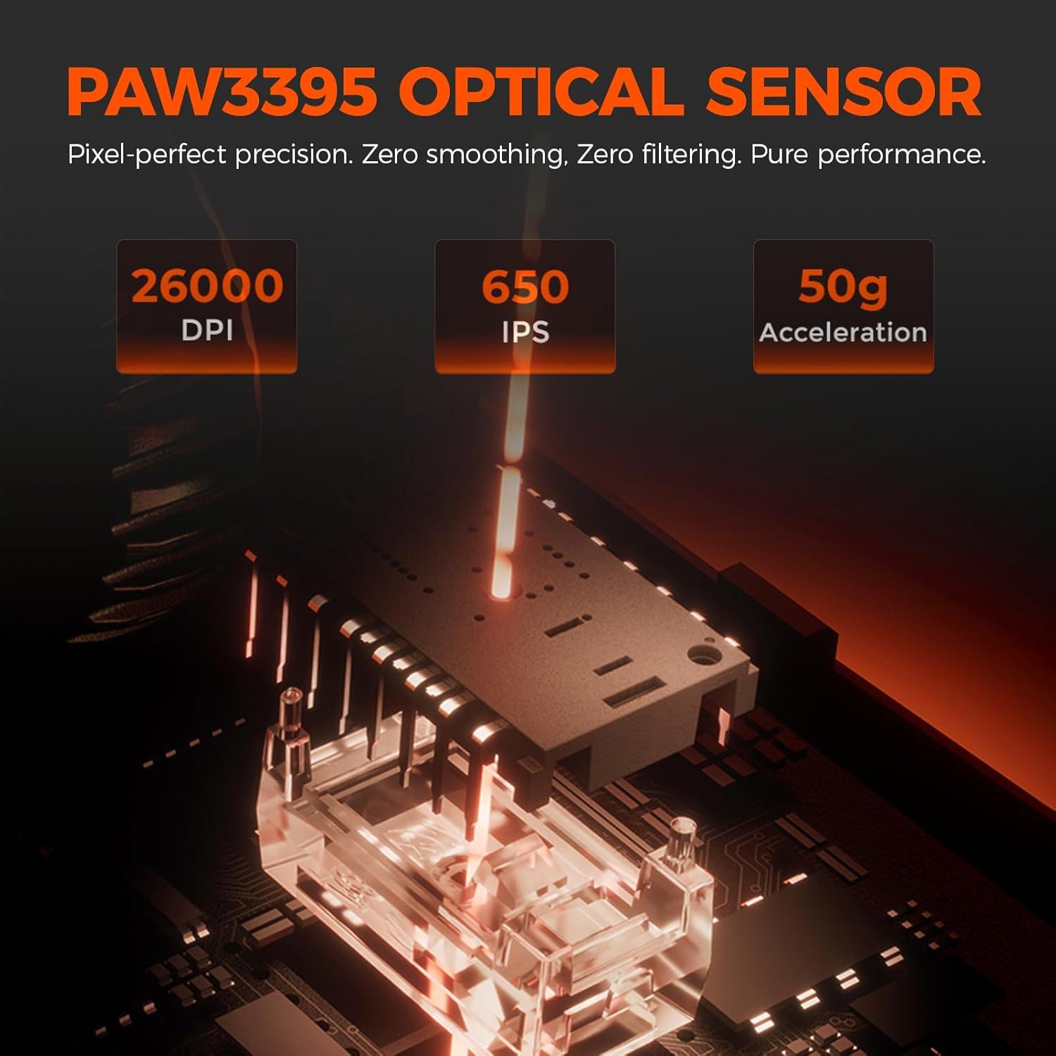 PRO-GRADE PRECISION & RESPONSIVENESS – Dominate the game with the advanced PAW3395 sensor in this wireless gaming mouse.Offering adjustable sensitivity up to 26,000 DPI,650 IPS speed,and 50g acceleration,combined with ultra-low latency and a 1000 Hz polling rate, it delivers the pinpoint tracking and instant response needed for victory in FPS and esports titles.