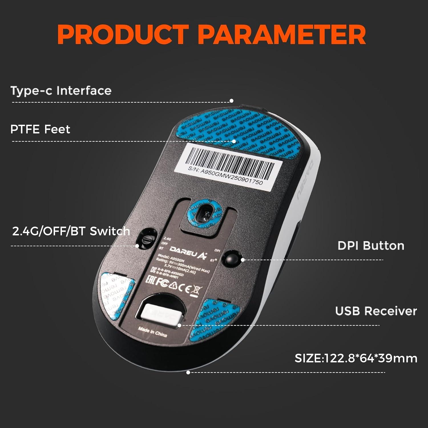 DAREU A950GM Wireless Gaming Mouse, 60g Lightweight, 26K DPI PAW3395 Optical Sensor, 2.4G/BT/Wired,Support 30-40min Fast Charge, 5 Programmable Buttons for PC/Laptop/Mac(Black)