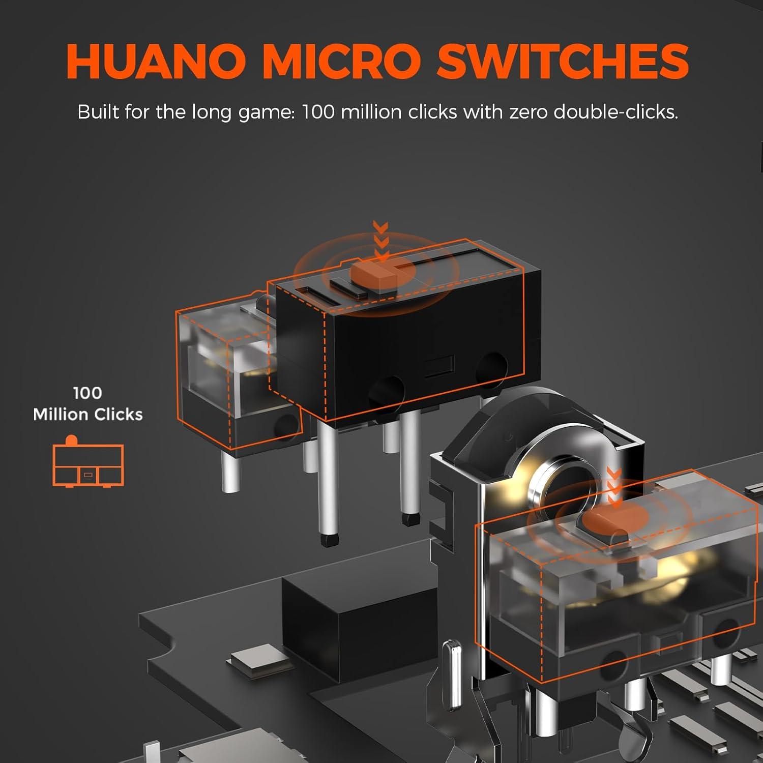 DURABLE & COMFORTABLE – Featuring durable PBT buttons that resist fading and oil buildup for long-lasting performance. Equipped with Huano micro switches that deliver crisp, consistent clicks and a lifespan of up to 100 million clicks for reliable durability. Smooth 100% pure PTFE feet ensure effortless gliding, creating a seamless connection to your game. The symmetrical ergonomic shape, combined with a skin-friendly coating, promotes a natural grip and reduces hand and wrist fatigue during extended sessions.