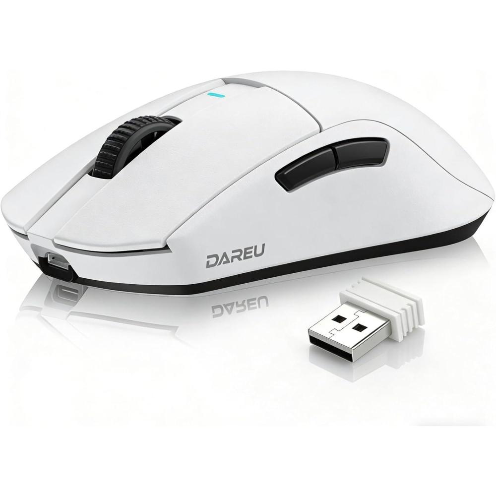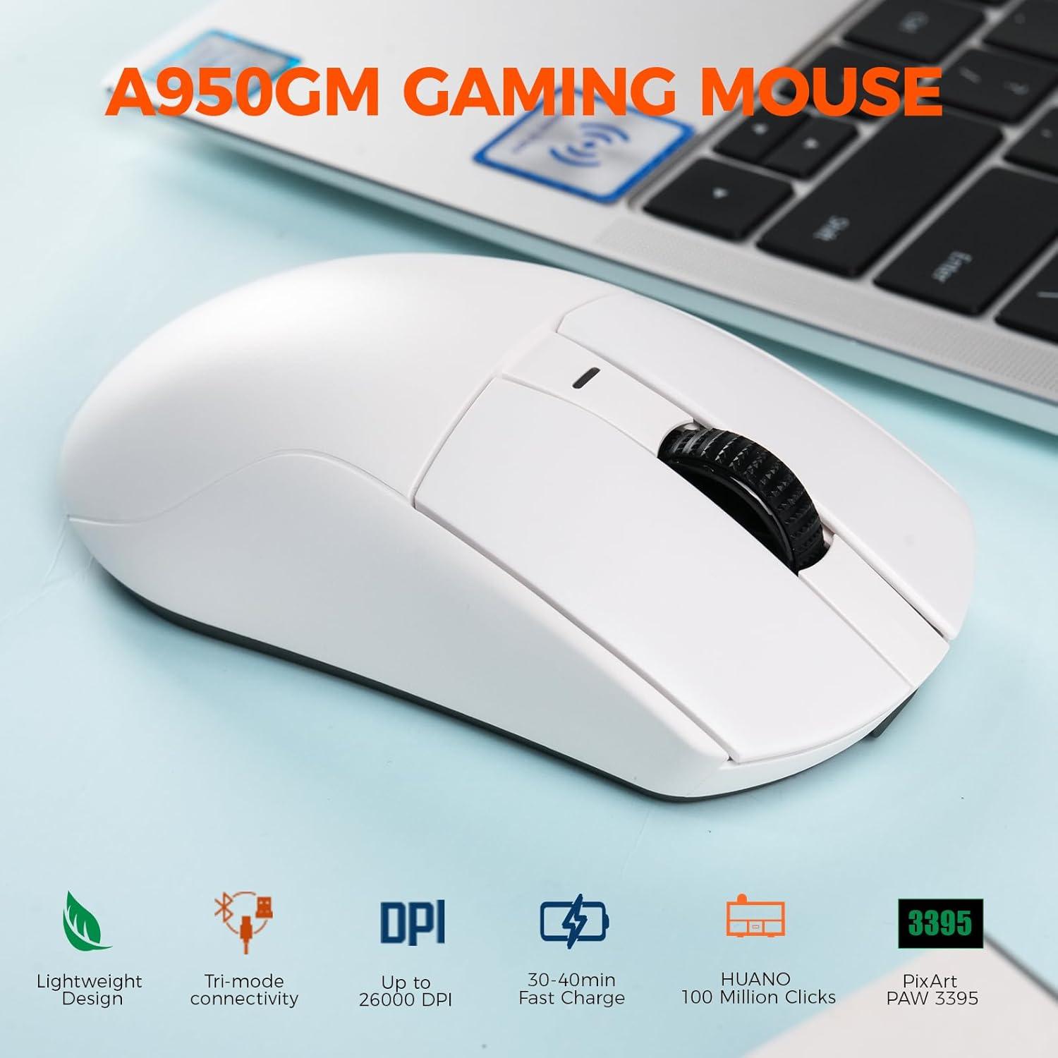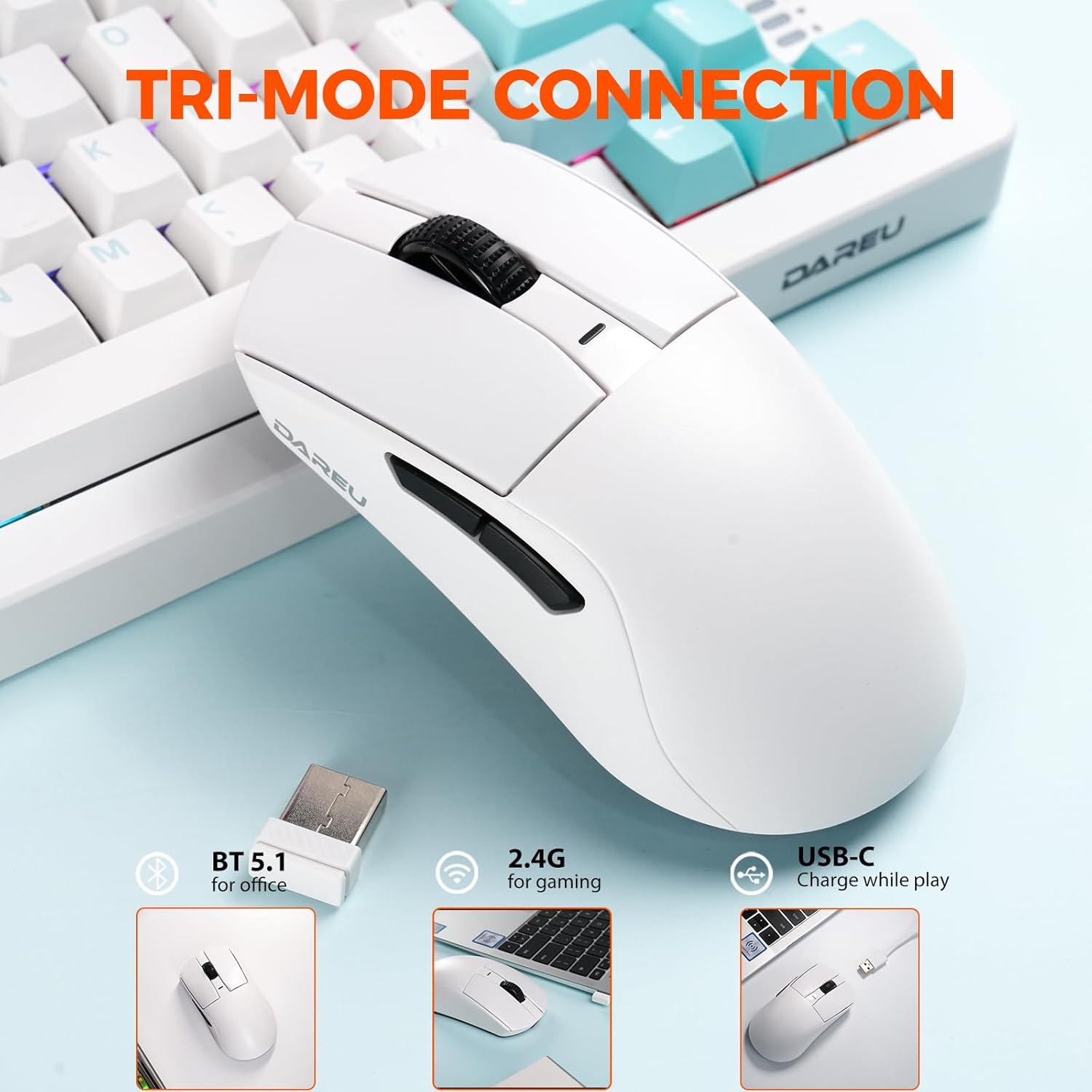 DAREU A950GM Wireless Gaming Mouse, 60g Lightweight, 26K DPI PAW3395 Optical Sensor, 2.4G/BT/Wired,Support 30-40min Fast Charge, 5 Programmable Buttons for PC/Laptop/Mac(White)