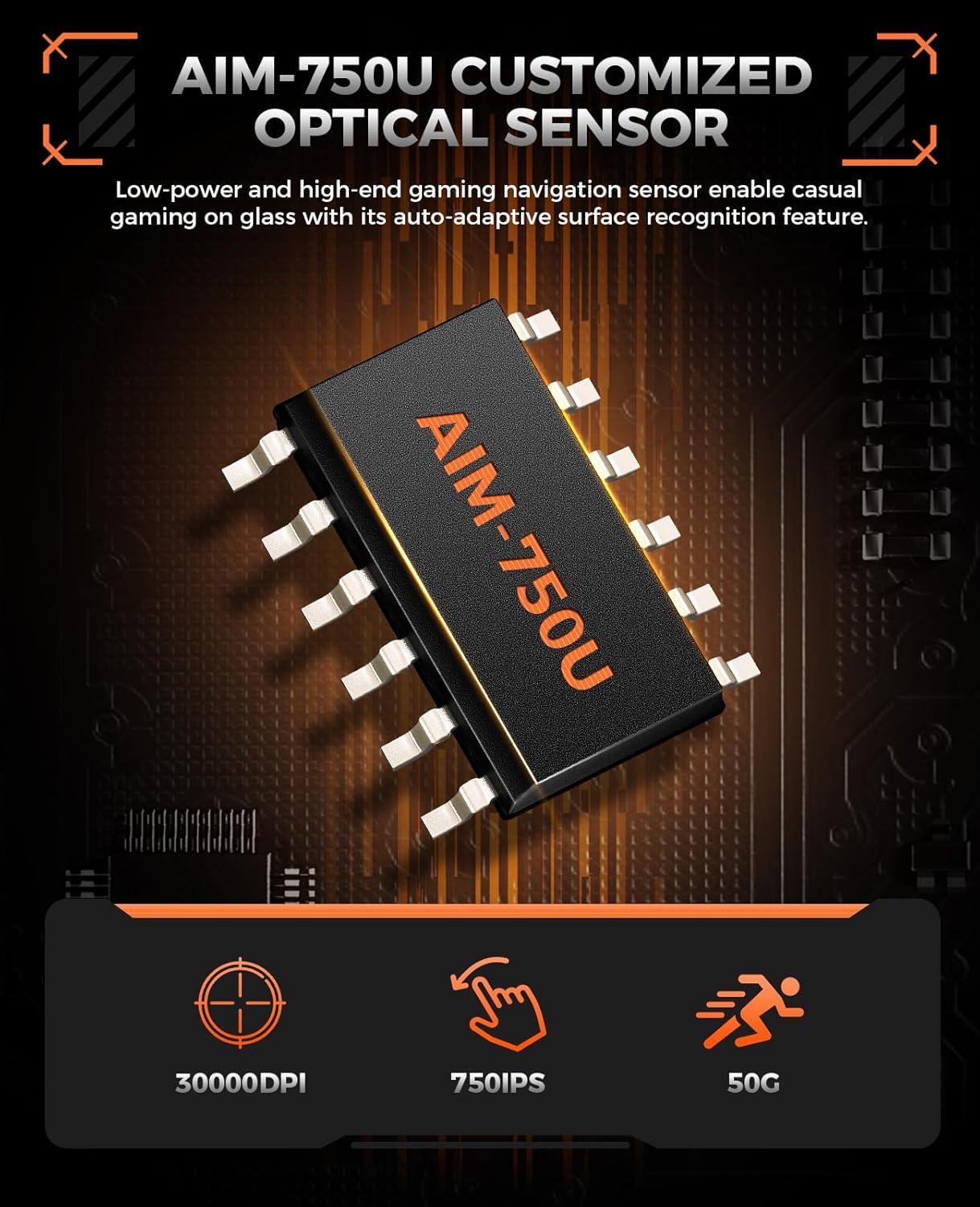 AIM-750U 30K OPTICAL SENSOR-Sensor of the wireless gaming mouse features auto-adaptive technology that automatically adjusts to different desktop surfaces to improve mouse precision. Easily play games on glass and textured surfaces, capable of 750 IPS speed, 50g acceleration, and 30,000 programmable DPI.