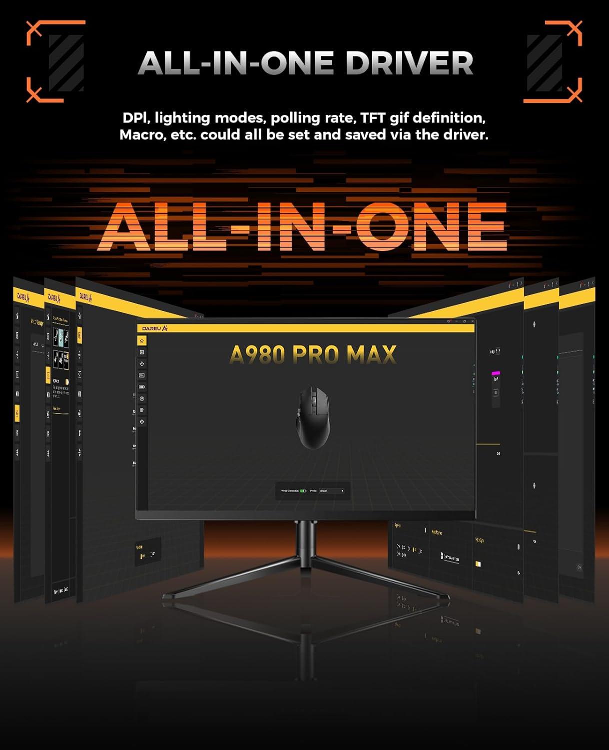 TRI-MODE CONNECTION PROGRAMMABLE MOUSE-A980PROMAX mouse supports wired USB-C /BT5.1/2.4Ghz wireless connection mode for PC, laptop, Mac, tablet devices, and Windows, macOS systems. You can use the software to set macros, key functions, DPI, polling rate, custom movies, etc.