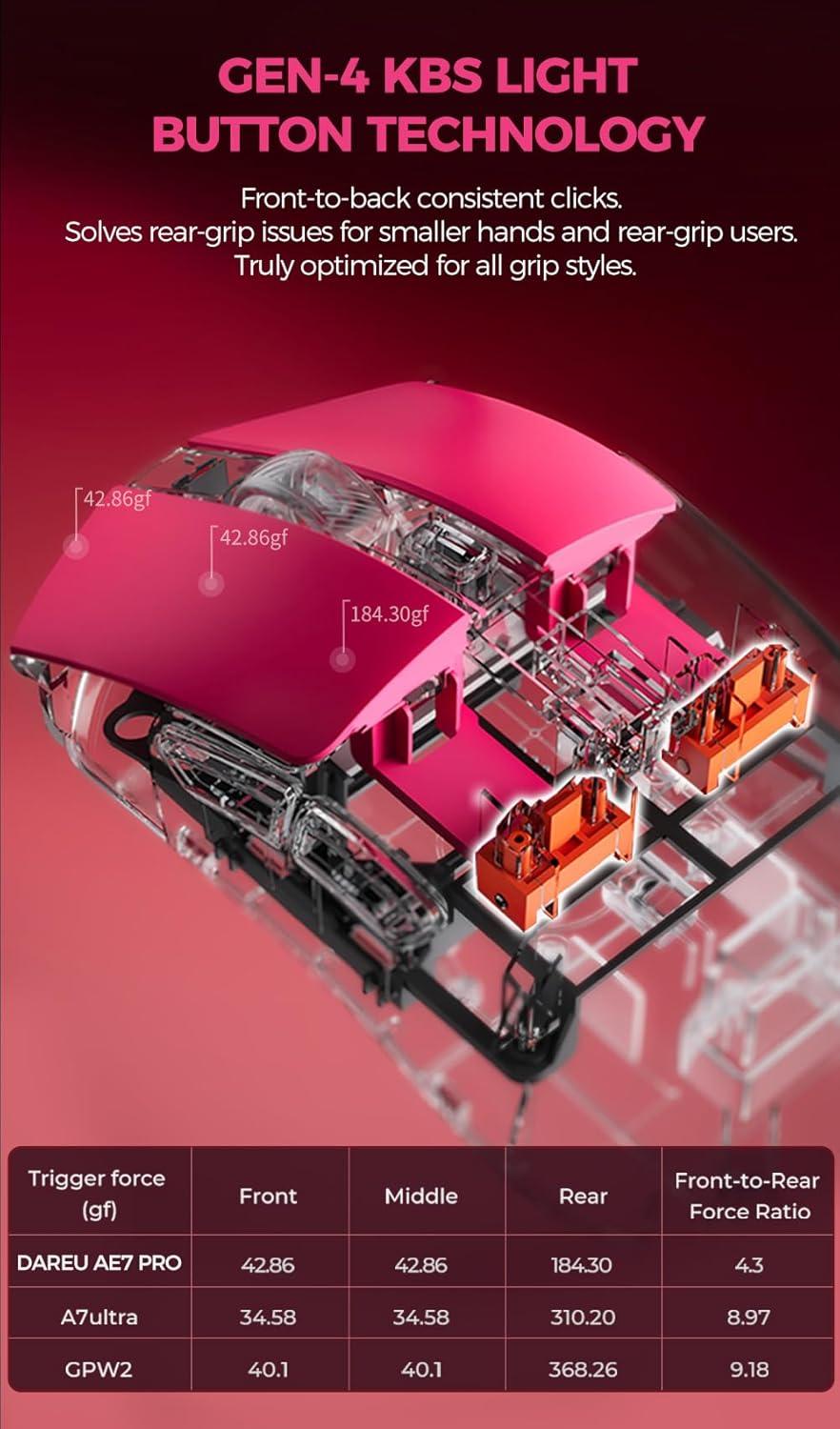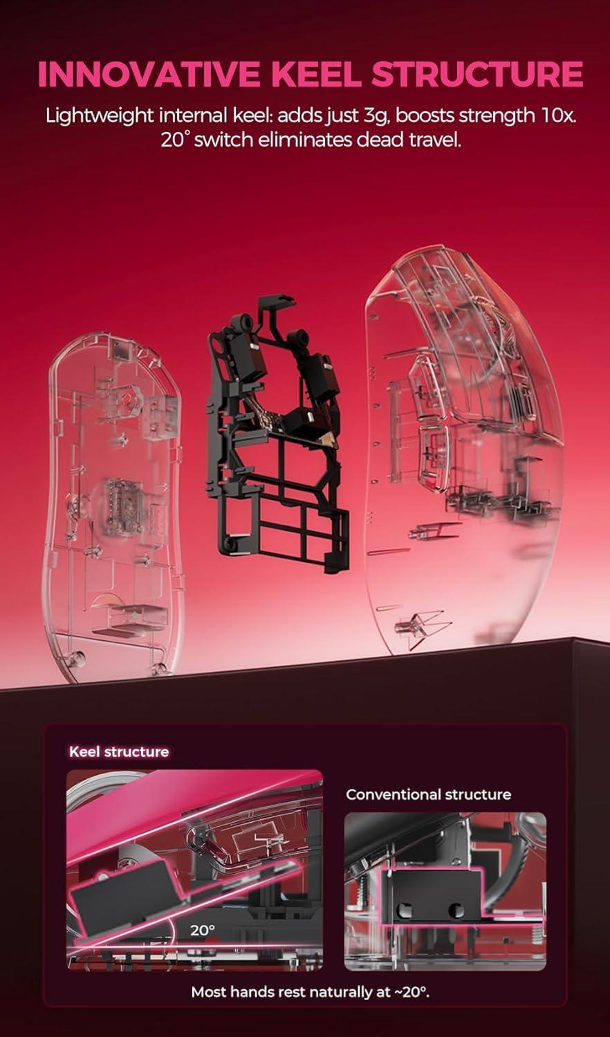 Keel Structure & KBS Light Button Tech: Innovative Keel structure boosts structural strength 10x, minimizing drop/pressure damage. 20° micro switches align with finger curvature for vertical force transfer—eliminates false clicks during rapid movements. Significantly reduces fatigue in high-frequency clicking. KBS Light system delivers consistent tactile feedback across front/middle/rear button zones, solving triggering difficulties for rear-grip users, truly supporting all grip styles.