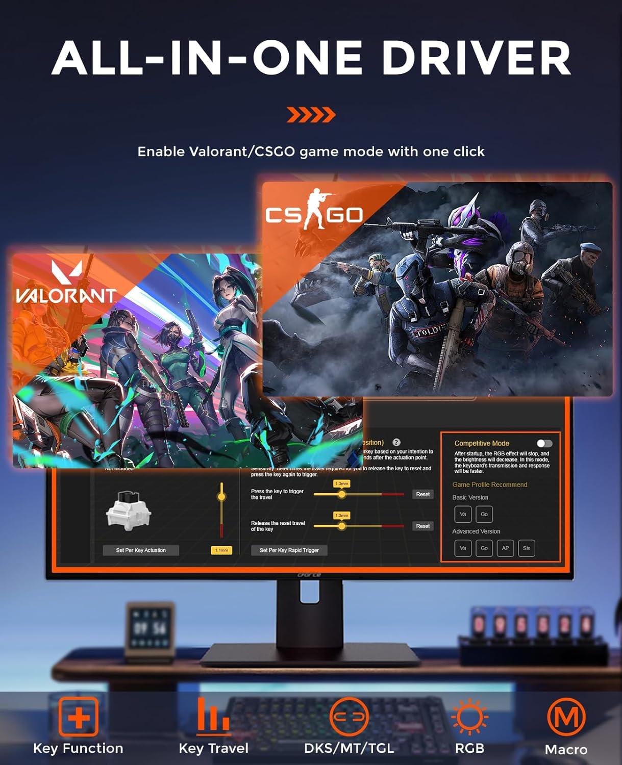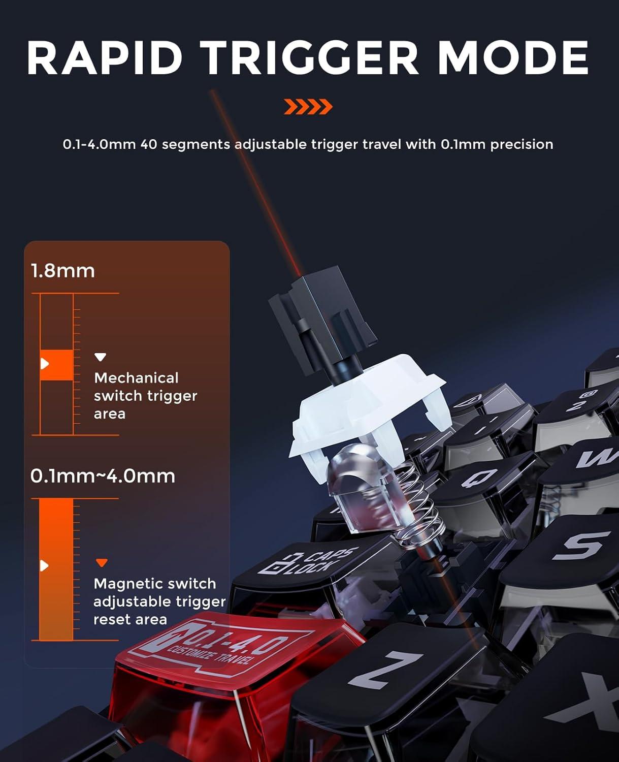KEYBOARD-Customizable hall effect magnetic switches,40 levels of per-key actuation (0.1 – 4.0mm), with an adjustable precision of 0.1mm. 4-in-1 action keys: up to 4 different commands in the same key.Rapid trigger: providing 20 times faster accuracy and 11 times faster response than traditional mechanical keyboards.