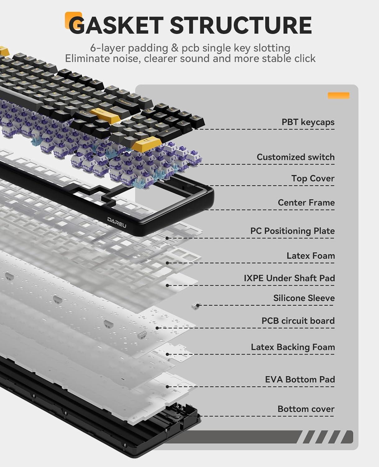 GASKET MOUNT & PCB SINGLE KEY SLOTTING-DAREU EK98pro mechanical keyboard utilizes a gasket structure with FR4 material 1.2mm thick PCB circuit board and single key slotted design to provide greater resilience and stability for a softer, more resilient feel.The 6-layer padding fills the internal gaps and reduces noises, making the sound more focused and crisp, providing a more solid percussive feeling.