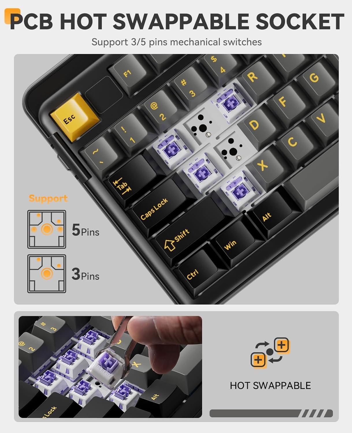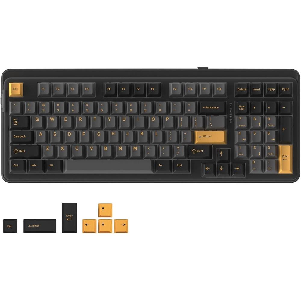 TRI-MODE CONNECTION & NKRO-The wireless mechanical keyboard provides three connection methods(BT 5.1/2.4GHz wireless/USB C wired). It can be connected to up to five devices at the same time. With N-key rollover, the keyboard can respond to the simultaneous press of multiple keys, all 97 keys are conflict-free, helpful for using hotkeys, or in a highly exciting real-time game.