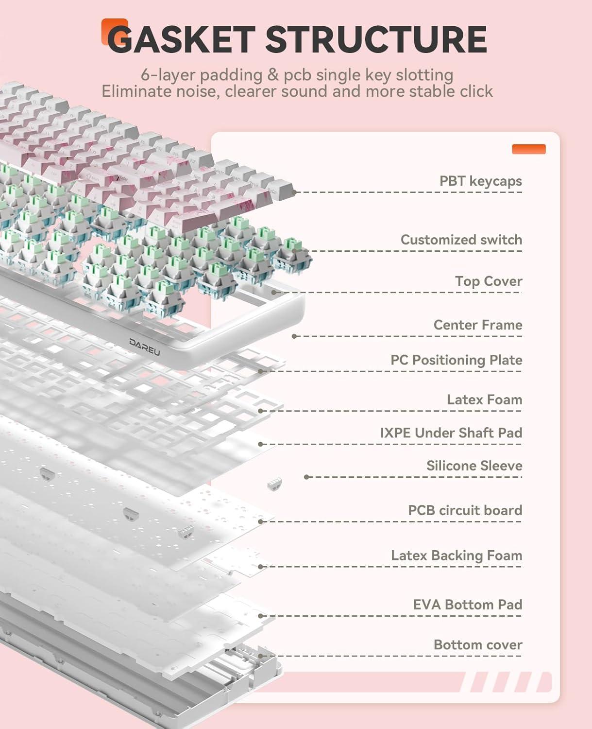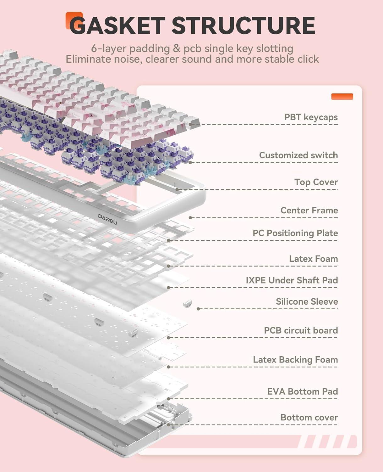 GASKET MOUNT & PCB SINGLE KEY SLOTTING-DAREU EK98pro mechanical keyboard utilizes a gasket structure with FR4 material 1.2mm thick PCB circuit board and single key slotted design to provide greater resilience and stability for a softer, more resilient feel.The 6-layer padding fills the internal gaps and reduces noises, making the sound more focused and crisp, providing a more solid percussive feeling.