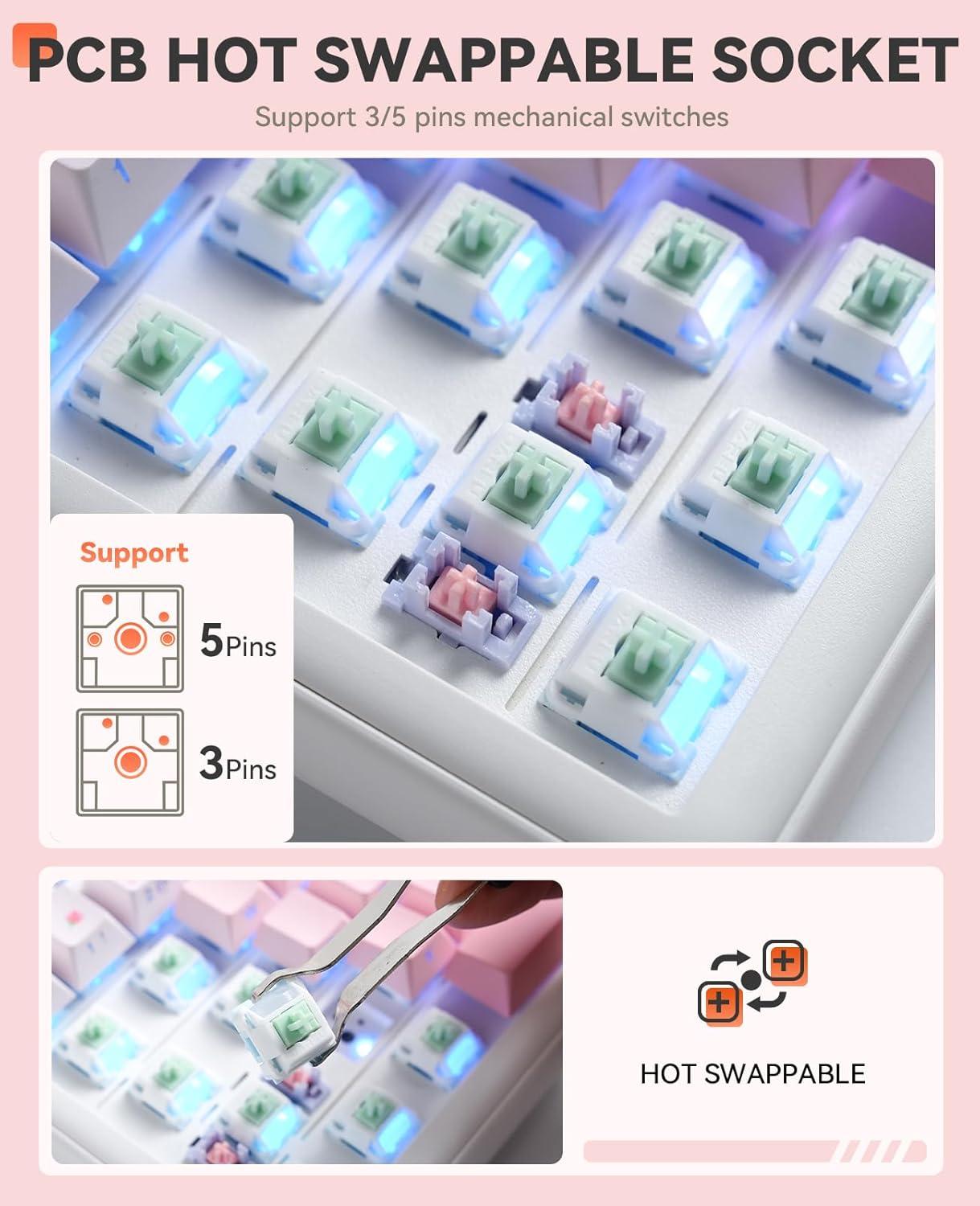 TRI-MODE CONNECTION & NKRO-The wireless mechanical keyboard provides three connection methods(BT 5.1/2.4GHz wireless/USB C wired). It can be connected to up to five devices at the same time. With N-key rollover, the keyboard can respond to the simultaneous press of multiple keys, all 97 keys are conflict-free, helpful for using hotkeys, or in a highly exciting real-time game.