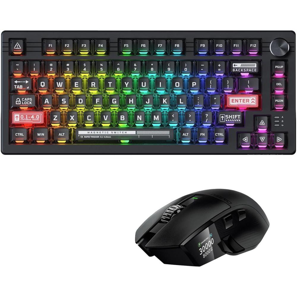 Keyboard:Customizable hall effect magnetic switches,40 levels of per-key actuation (0.1 – 4.0mm), with an adjustable precision of 0.1mm. 4-in-1 action keys: up to 4 different commands in the same key.Rapid trigger: providing 20 times faster accuracy and 11 times faster response than traditional mechanical keyboards.