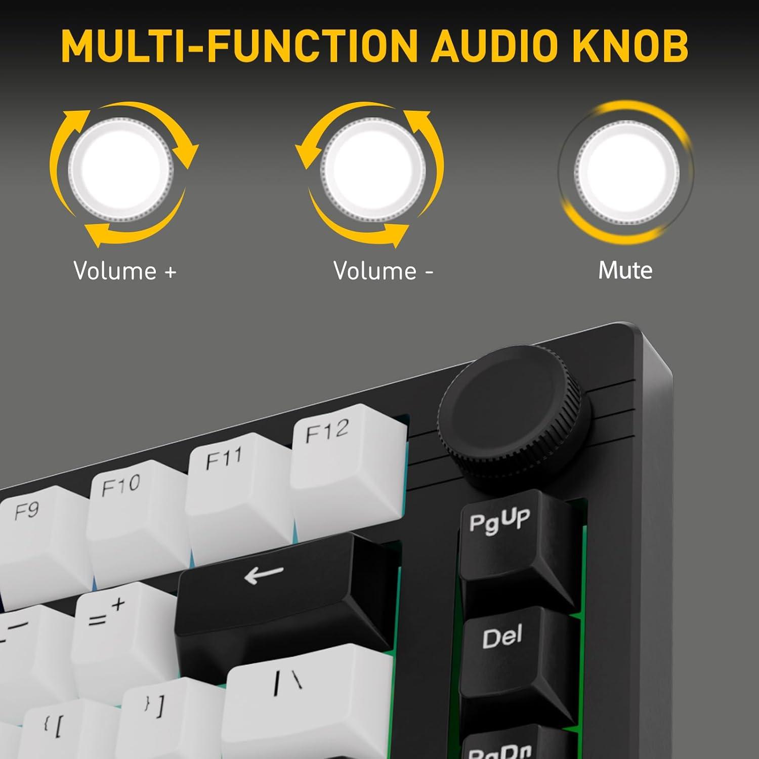 Keyboard:Gasket mount keyboard,contains 2pcs high-density sound-absorbing foams and a flexible pc positioning board, it reduces keystroke noises and brings a more comfortable typing experience. 81 keys layout and 75% mechanical keyboard makes the desktop more concise. multiple fn key combos provide shortcut commands. the knob button brings quick access to volume adjustments(volume, play/pause),more convenience and practicality.