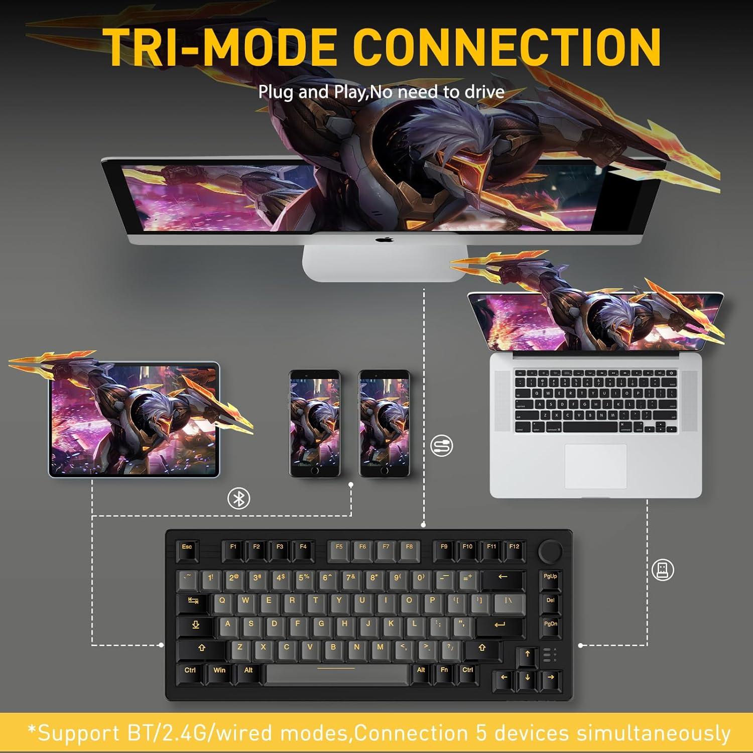 Keyboard:Gasket mount keyboard,contains 2pcs high-density sound-absorbing foams and a flexible pc positioning board, it reduces keystroke noises and brings a more comfortable typing experience. 81 keys layout and 75% mechanical keyboard makes the desktop more concise. multiple fn key combos provide shortcut commands. the knob button brings quick access to volume adjustments(volume, play/pause),more convenience and practicality.